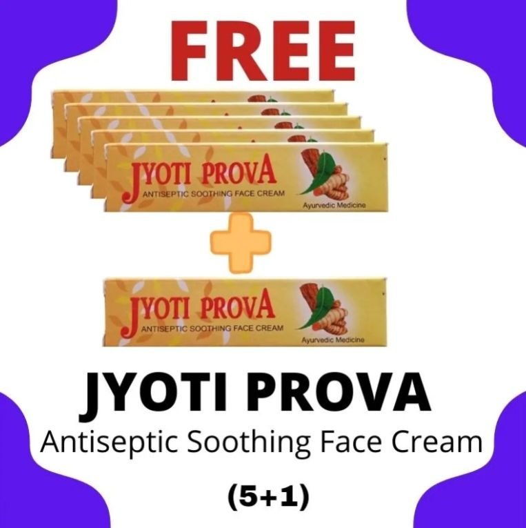 Jyoti Prova Face Cream Offer Pack (5+1) Jyotiprova Antiseptic Soothing Face Cream is formulated with a blend of natural ingredients renowned for their soothing, healing, and antiseptic properties. Here are the benefits of each key ingredient: Haldi (Turmeric): Contains curcumin, which has potent anti-inflammatory properties. Helps to reduce redness, swelling, and irritation. Acts as a natural antiseptic, preventing infections and promoting healing. Chandan (Sandalwood): Known for its cooling and soothing properties, alleviating skin irritation and inflammation. Helps to tone and tighten the skin, reducing the appearance of pores. Natural antiseptic properties cleanse the skin and prevent bacterial growth. Neem: Exhibits powerful antibacterial, antifungal, and antiviral properties. Helps to clear acne and prevent further breakouts. Soothes irritated skin and reduces redness and inflammation. Makaradhwaja: Enhances skin regeneration and promotes cellular repair. Boosts skin elasticity and firmness, reducing the signs of aging. Improves skin texture and imparts a healthy glow. Madhu (Honey): A natural humectant, attracting and retaining moisture in the skin. Contains antioxidants that help protect the skin from environmental damage. Has antibacterial properties, preventing infections and promoting wound healing. Nishinda: Soothes sensitive and inflamed skin, providing relief from itching and irritation. Helps to calm allergic reactions and reduce redness. Contains antioxidants that protect the skin from oxidative stress. Alum: Acts as an astringent, tightening and toning the skin. Helps to reduce excess oiliness and minimize the appearance of pores. Has antiseptic properties, preventing infections and promoting skin health. Borax: Exhibits antiseptic properties, cleansing the skin and preventing bacterial growth. Soothes minor cuts, burns, and insect bites, promoting healing. Helps to balance oil production and maintain clear, healthy skin. Jyoti Prova Face Cream combines these natural ingredients to provide effective relief from skin irritation, inflammation, and infections. Whether used as a daily moisturizer or as a targeted treatment for specific skin concerns, this cream nourishes and protects the skin, leaving it soft, smooth, and radiant. Jyoti Prova Face Cream Offer Pack (5+1) an ayurvedic medicine preventive, curative and healing for dry skin, cuts, burns, pimples, Freckled & Cracked skin, Vaginitis, Nipples & Lips A SHOOTHING AFTERSHAVE SHAVING CREAM RENDERS THE FACE SOFT AND BRIGHT